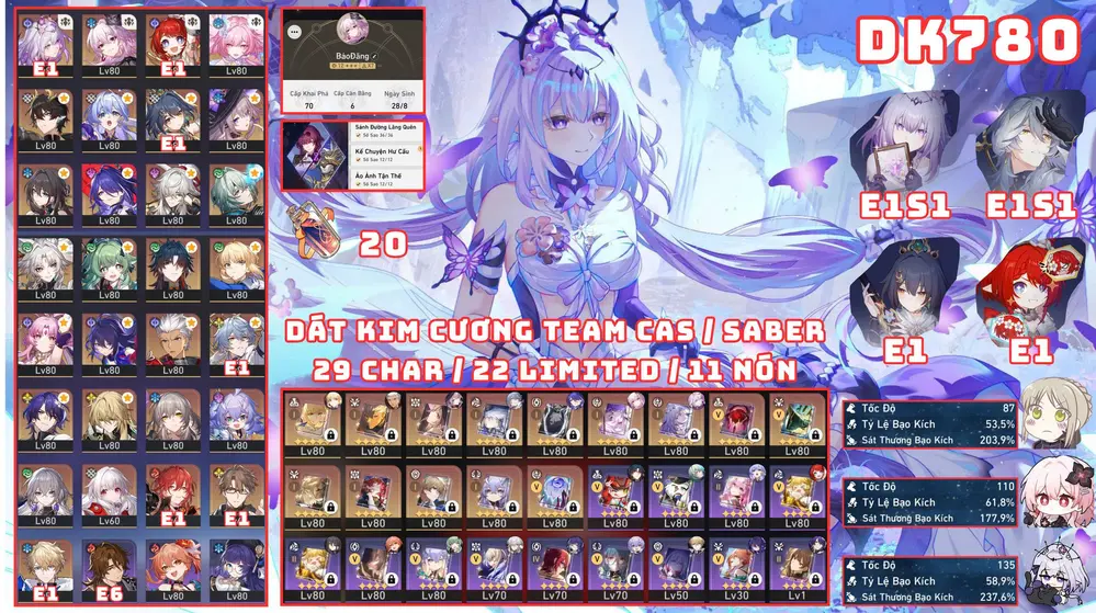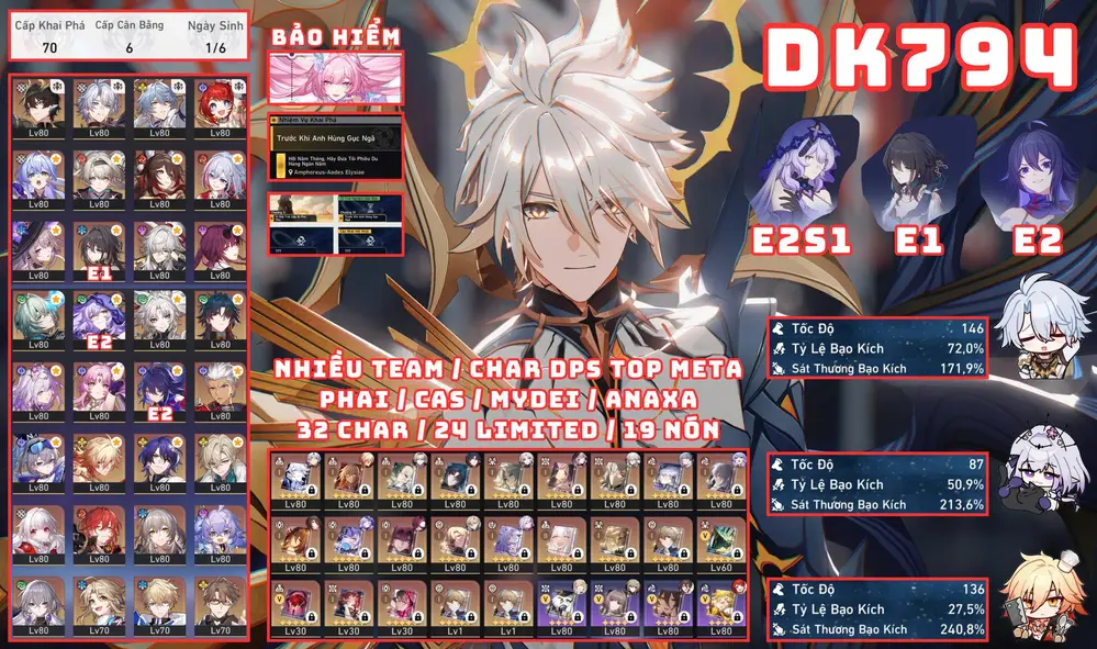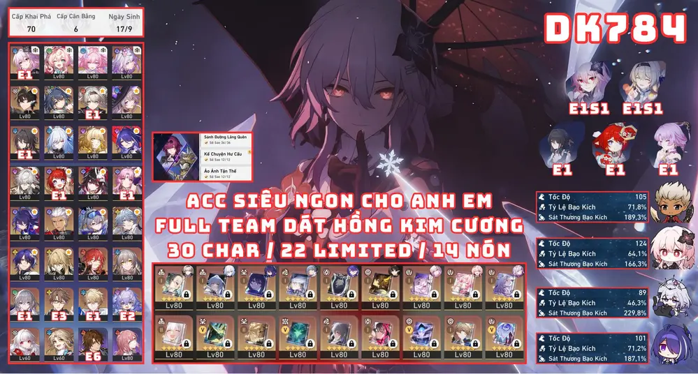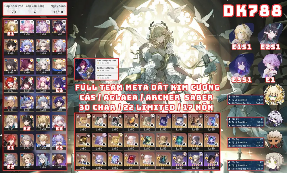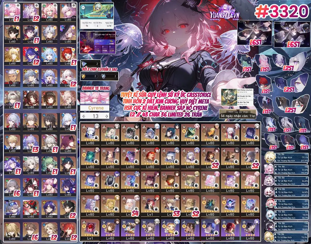 Khách góp [ #3320 TUYỆT PHẨM PHẨM TỬ LONG DIỆT THẾ / MƯA TINH HỒN KÈM DÀN TRẤN CỰC KHỦNG! ] CASTORICE E2S1 + PHAINON E0S1 + CYRENE E1S1 + HYACINE E0S1 + EVERNIGHT E0S1 + ACHERON E2S1 + HYSILENS E1S1 + TRIBBIE E1S1 + AGLAEA E0S1 + THE HERTA E0S1 + SUNDAY E0S1 + ROBIN E0S1 + LINGSHA E0S1 + RAPPA E0S1 + FEIXIAO + FIREFLY E1S1 + FUGURE + KAFKA E0S1 + BLACK SWAN E1 + HUO HUO E1 + SPARKLE E1S2 + SÓI BẠC E0S1 + JINGLIU E0S1 + BRONYA E6S2 + IL E2S1 + ... 13 TRANG BANNER LIMIT.
